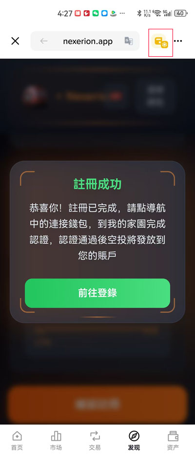 - 进入注册页,在注册页中填写昵称完成注册,立即获得15枚Nexerion币(价值约1.3USDT)