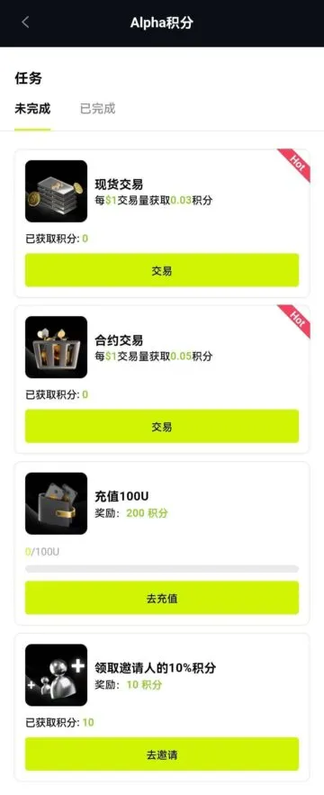 | 交易所KYC | 完成Lv.2认证 | 30 Alpha |